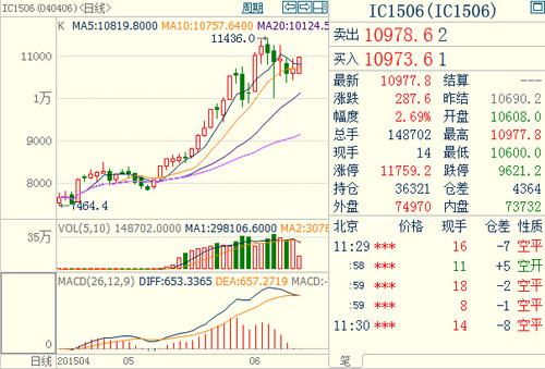 中證500期指1506主力合約在連續(xù)下跌調(diào)整了5日后,今日迎來了大幅上行,早間IC1506合約以10608.0點開盤,隨后出現(xiàn)了震蕩上行,一舉吞并了下跌的3根K線,上午最終報收10977.8點,上漲287.6點,漲幅為2.69%,再度來到11000整數(shù)關(guān)口。交易方面,目前共成交148702手,持倉36321手。